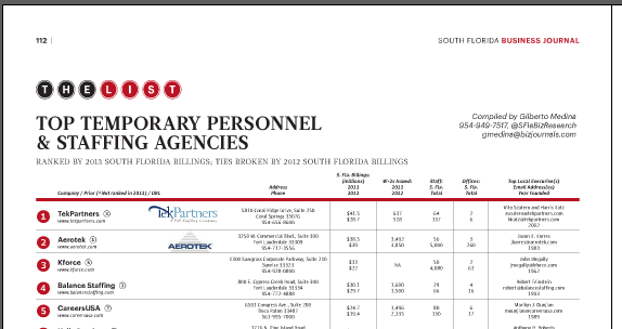 This week’s South Florida Business Journal featured the top Temporary Personnel & Staffing Agencies. While I can’t reprint the list for you, below is a sample. I don’t work for SFBJ but if you get a job from their lists then the subscription more than pays for itself.